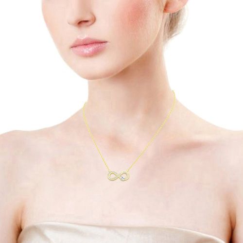 This infinity necklace showcase a solitaire round brilliant diamond set beautifully in a 14k gold pave diamond pendant with a matching gold chain for the stunning look.