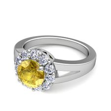 This halo ring is classically elegant with a round shaped radiant yellow sapphire encircled by dazzling round brilliant diamonds set in a lustrous band to captivate elegance. The engagement ring fits gorgeously together with a matching curved petite diamond wedding band to make a harmonious couple! Available in 14k, 18k white, yellow or rose gold, and platinum.