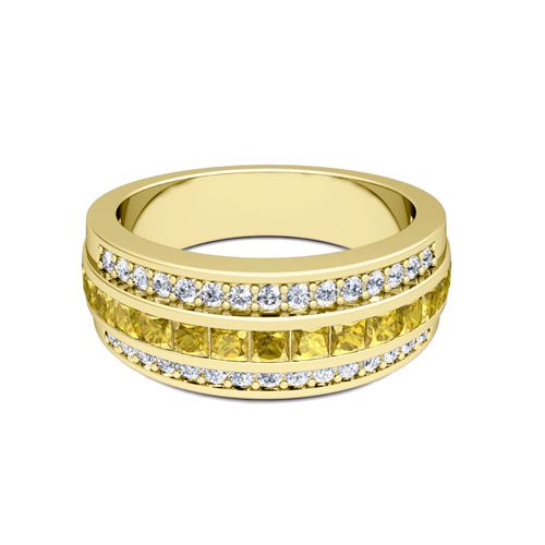 This stunning wedding band showcases princess cut yellow sapphires channel set in 14k gold band with sparkling diamonds studded on each side. Perfect wedding ring for men and women.