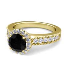 This elegant 18k gold bridal set showcases a 5mm round black diamond heirloom engagement ring and a perfect matching milgrain diamond wedding ring.
