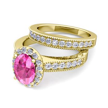 Halo Bridal Set: Milgrain Diamond and Pink Sapphire Wedding Ring Set in 18k Gold, 9x7mm