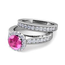 Elegant, classic and timeless design, this bridal set showcases a halo engagement ring of an oval shaped natural pink sapphire surrounded by dazzling diamonds set in a milgrained ring band accented with round brilliant cut diamonds. A perfect match diamond wedding band completes the gorgeous look of this beautiful bridal set. Available in 14k, 18k white, yellow or rose gold, and platinum.