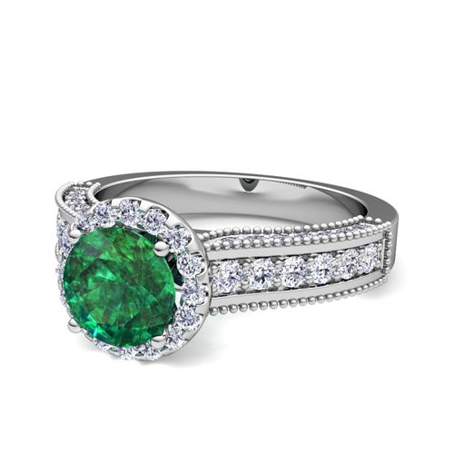 This vintage inspired heirloom engagement ring is crafted beautifully in a platinum halo setting that a round cut 6mm emerald is surrounded by pave-set diamonds. A milgrained ring shank with three rows of dazzling round brilliant cut diamonds add extra sparkles to this stunning emerald ring. Matching wedding ring is available as a perfect bridal set for your love.