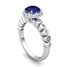 This elegant halo engagement ring showcases sparkling diamonds surround a 5mm blue sapphire set in a platinum bezel set diamond ring band to complete the gorgeous look.