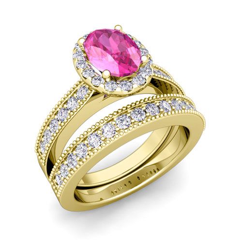 Elegant, classic and timeless design, this bridal set showcases a halo engagement ring of an oval shaped natural pink sapphire surrounded by dazzling diamonds set in a milgrained ring band accented with round brilliant cut diamonds. A perfect match diamond wedding band completes the gorgeous look of this beautiful bridal set. Available in 14k, 18k white, yellow or rose gold, and platinum.