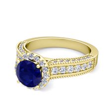 This vintage inspired bridal set showcases a heirloom engagement ring of a round cut natural blue sapphire surrounded by dazzling diamonds set in a milgrained ring band accented with round brilliant cut diamonds. A perfect match diamond wedding band completes the gorgeous look of this beautiful engagement wedding ring set. Available in 14k, 18k white, yellow or rose gold, and platinum.
