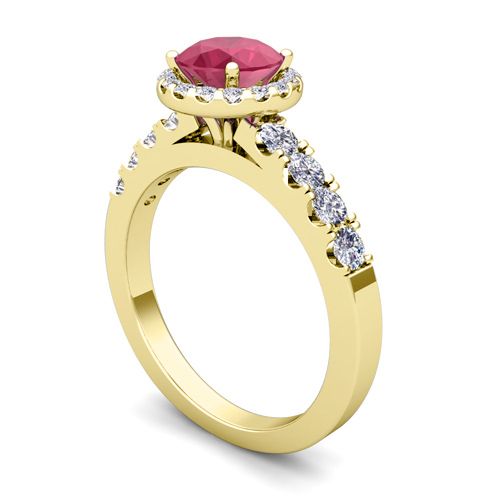 This stunning halo engagement ring showcases sparkling diamonds surround a 5mm ruby set in a 14k gold brilliant diamond ring band to complete the gorgeous look.