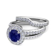 Beautifully striking and unique, this eye-catching halo ring is flawlessly crafted with two floating spirals of pave set diamonds to embellish the center blue sapphire surrounded by dazzling diamonds to add extra sparkles! To complete the gorgeous look, a matching pave diamond wedding band is available to be a perfect bridal set for your love. Available in 14k, 18k white, yellow or rose gold, and platinum.