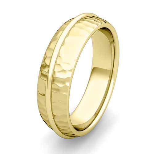 This 14k gold 6mm wedding ring features a shiny circle around the entire comfort fit wedding band with a hammered finish to add a beautiful texture to this unique ring.