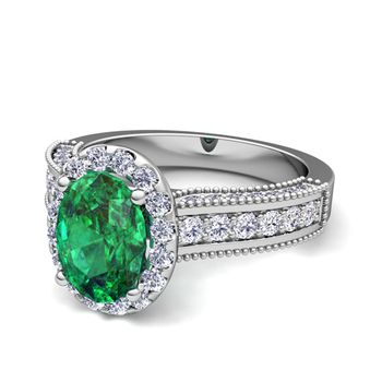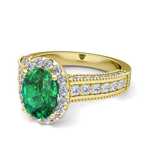 This vintage inspired heirloom engagement ring is crafted beautifully in a 14k gold halo setting that a 7x5mm oval shaped emerald is surrounded by pave-set diamonds. A milgrained ring shank with three rows of dazzling round brilliant cut diamonds add extra sparkles to this stunning emerald ring. Matching wedding ring is available as a perfect bridal set for your love.