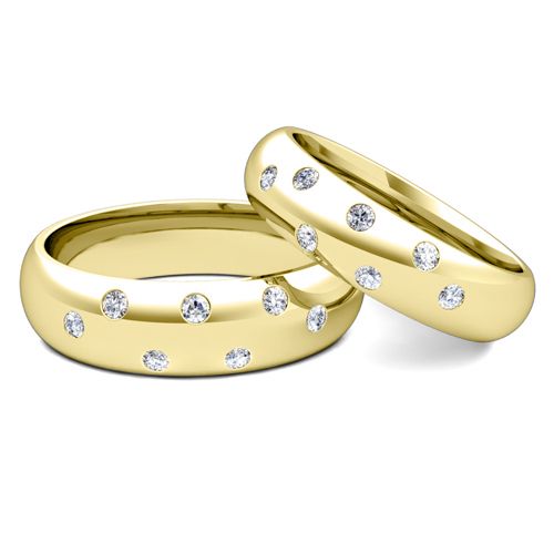 This beautiful matching wedding band showcases sparkling round diamonds set in 18k gold scatter rings. The fun and fabulous design makes this ring set a perfect choice for couples looking for an elegant yet unique wedding ring set as his and hers wedding ring set. Available in 14k, 18k white, yellow or rose gold, and platinum.