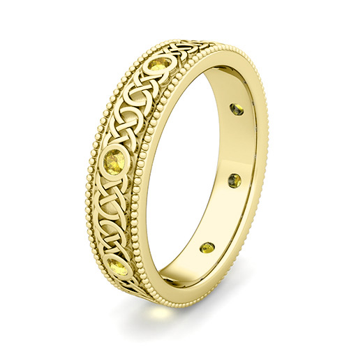 This eye-catching matching wedding ring set features beautiful Celtic knots interspersed with bezel set yellow sapphires set in Celtic knot wedding bands as his and hers wedding ring set. This contemporary taken on such a traditional Celtic knot design creates a stunning wedding ring set for couples looking for an unique wedding ring set. Available in 14k, 18k white, yellow or rose gold, and platinum.