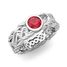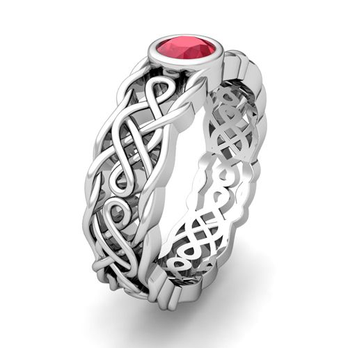 This eye-catching matching wedding ring set features beautiful Celtic knots interspersed with a bezel set solitaire ruby set in Celtic knot wedding bands as his and hers wedding ring set. This contemporary taken on such a traditional Celtic knot design creates a stunning wedding ring set for couples looking for an unique wedding ring set. Available in 14k, 18k white, yellow or rose gold, and platinum.