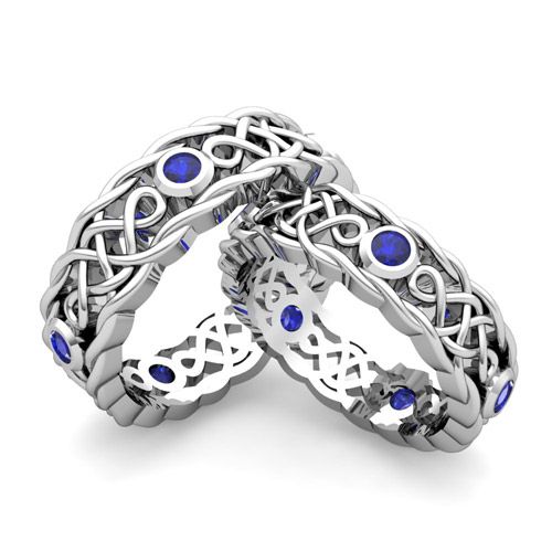 This eye-catching matching wedding ring set features beautiful Celtic knots interspersed with bezel set round shape blue sapphires set in Celtic knot wedding bands as his and hers wedding ring set. This contemporary taken on such a traditional Celtic knot design creates a stunning wedding ring set for couples looking for an unique wedding ring set. Available in 14k, 18k white, yellow or rose gold, and platinum.