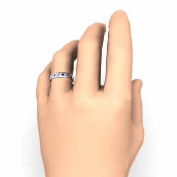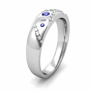 This 14k gold mens wedding band is inspired by the beauty of nature featuring unique texture on the surface of the ring studded with brilliant diamonds and blue sapphires to add sparkling effect.