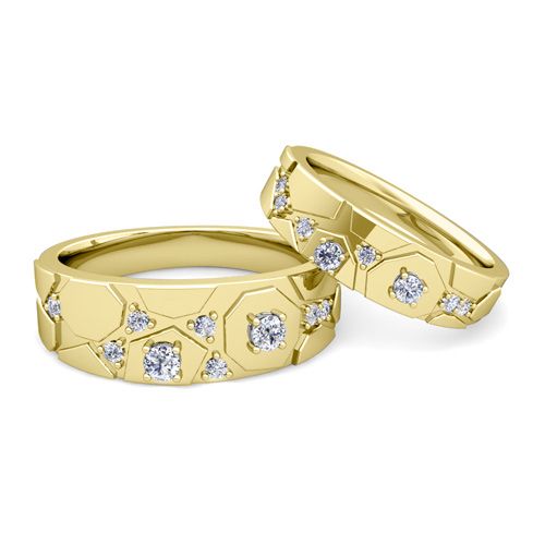 This exquisite 14k gold matching wedding ring set showcases beautiful graphic blocks across the top of his and hers wedding rings highlighted with sparkling diamonds.