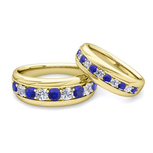 This stunning brilliant matching wedding ring set features sparkling round diamonds alternating with blue sapphires set beautifully in pave set ring bands. The classic and timeless design makes this wedding ring set a perfect choice as a wedding band or anniversary ring for men and women to express their love to their loved one. Available in 14k, 18k white, yellow or rose gold, and platinum.