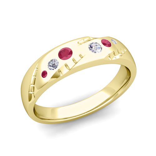 Matching Wedding Ring Set: Flush Set Diamond and Ruby Wedding Band in 14k Gold