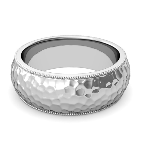 This 8mm hammered finish wedding band is framed by milgrain edges and rounded inside edges for comfortable wear. Perfect platinum wedding band for both men and women.