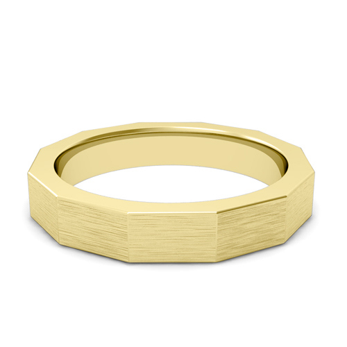 This 18k gold 4mm wedding band is striking and bold with a mixed brushed finish. Comfort is ensured with rounded inside edges of the ring.