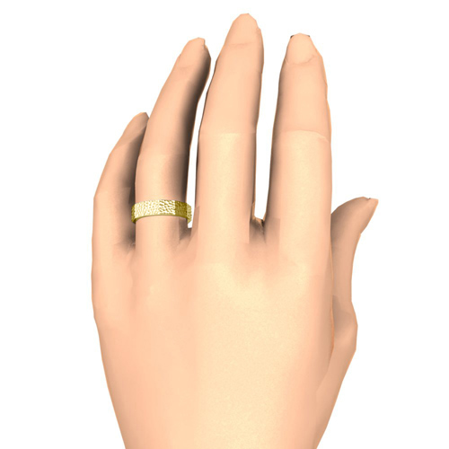 This 18k gold 8mm wedding band is striking and bold with a matte hammered finish. Comfort is ensured with rounded inside edges of the ring.