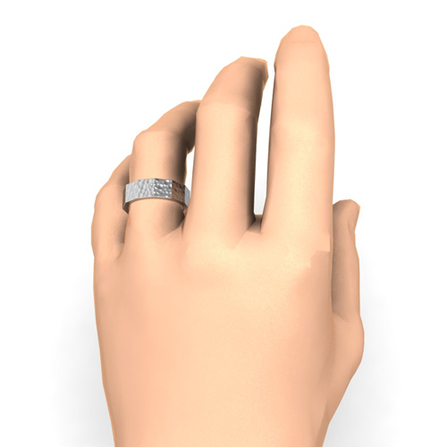 This platinum 8mm wedding band is striking and bold with a matte hammered finish. Comfort is ensured with rounded inside edges of the ring.