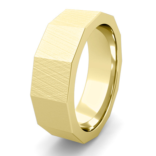 This 18k gold 6mm wedding band is striking and bold with a mixed brushed finish. Comfort is ensured with rounded inside edges of the ring.