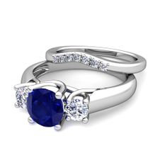 Two round brilliant cut diamonds bring an air of glamour to this classic 3 stone ring of a vibrant blue sapphire center stone. A matching curved diamond wedding band is available to complete the graceful design as an elegant bridal set. What a beautiful duet! Available in 14k, 18k white, yellow or rose gold, and platinum.