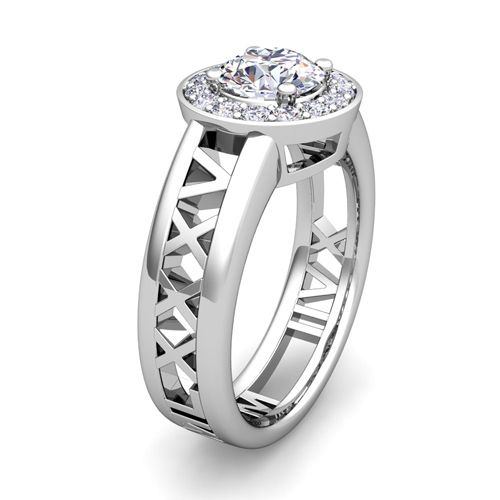 Create a breathtaking moment with this custom made roman numeral engagement ring that showcases a 5mm round shape diamond surrounded by sparkling diamonds set in a 18k gold halo setting with your special date converted to roman numerals. Roman numeral ring is one of the amazing ring designs to add your personal touch to your very special ring in life. Express your love today with this gorgeous roman numeral engagement ring!