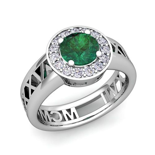 Create a breathtaking moment with this custom made roman numeral engagement ring that showcases a 7mm round shape emerald surrounded by sparkling diamonds set in a 14k gold halo setting with your special date converted to roman numerals. Roman numeral ring is one of the amazing ring designs to add your personal touch to your very special ring in life. Express your love today with this gorgeous roman numeral engagement ring!
