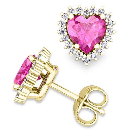 These eye-catching diamond and sapphire earrings showcase heart shaped pink sapphires framed by pave-set diamonds in 14k white or yellow gold studs creating a romantic gift for your love. Heart jewelry has been one of the most wanted jewelry accessories in womens jewelry box. Adore your love today with these lovely and elegant heart earrings.