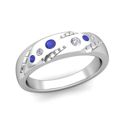 This 14k gold wedding band is inspired by the beauty of nature featuring unique texture on the surface of the ring studded with brilliant diamonds and blue sapphires to add sparkling effect.