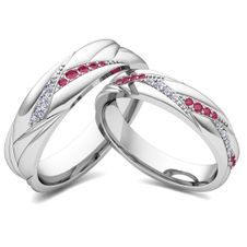 This unique wedding ring showcases beautiful fold detail texture highlighted with sparkling diamonds and vibrant rubies creating a stunning effect. This eye-catching wedding ring is a perfect choice for couples looking for a stylish and unique wedding band for him and hers. Available in 14k, 18k white, yellow or rose gold, and platinum.