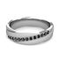 This unique wedding ring showcases black diamonds sparkling their way in the center row of the 14k gold satin finish comfort fit wedding band that is perfect ring for men and women.