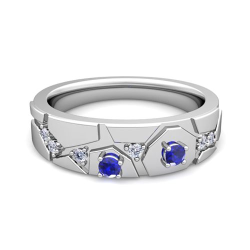 This exquisite wedding band showcases beautiful graphic blocks across the top of this ring highlighted with brilliant round diamonds and blue sapphires to add a sparkling effect. The eye-catching and unique design makes this ring a perfect choice for men or women who are looking a stylish and unique wedding anniversary ring. Available in 14k, 18k white, yellow or rose gold, and platinum.