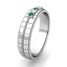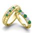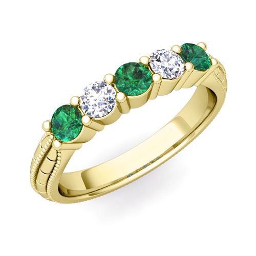 Five sparkling diamonds and emeralds take center place in this stunning matching wedding band set which is highlighted with a stripe of milgrain detail around the ring. This 5 stone wedding ring set is available in 14k, 18k white, yellow or rose gold, and platinum. A stunning and eye-catching! Perfect as an anniversary ring or wedding ring for him and her.