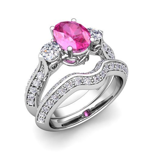 Vintage Inspired Diamond and Pink Sapphire Three Stone Ring Bridal Set in 14k Gold, 7x5mm