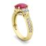 This 14k gold vintage inspired bridal set features a 7x5mm ruby ring and a matching curved diamond wedding ring for a look that is delicate and graceful.