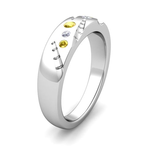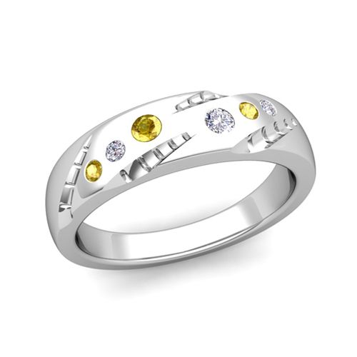 This platinum wedding band is inspired by the beauty of nature featuring unique texture on the surface of the ring studded with brilliant diamonds and yellow sapphires to add sparkling effect.